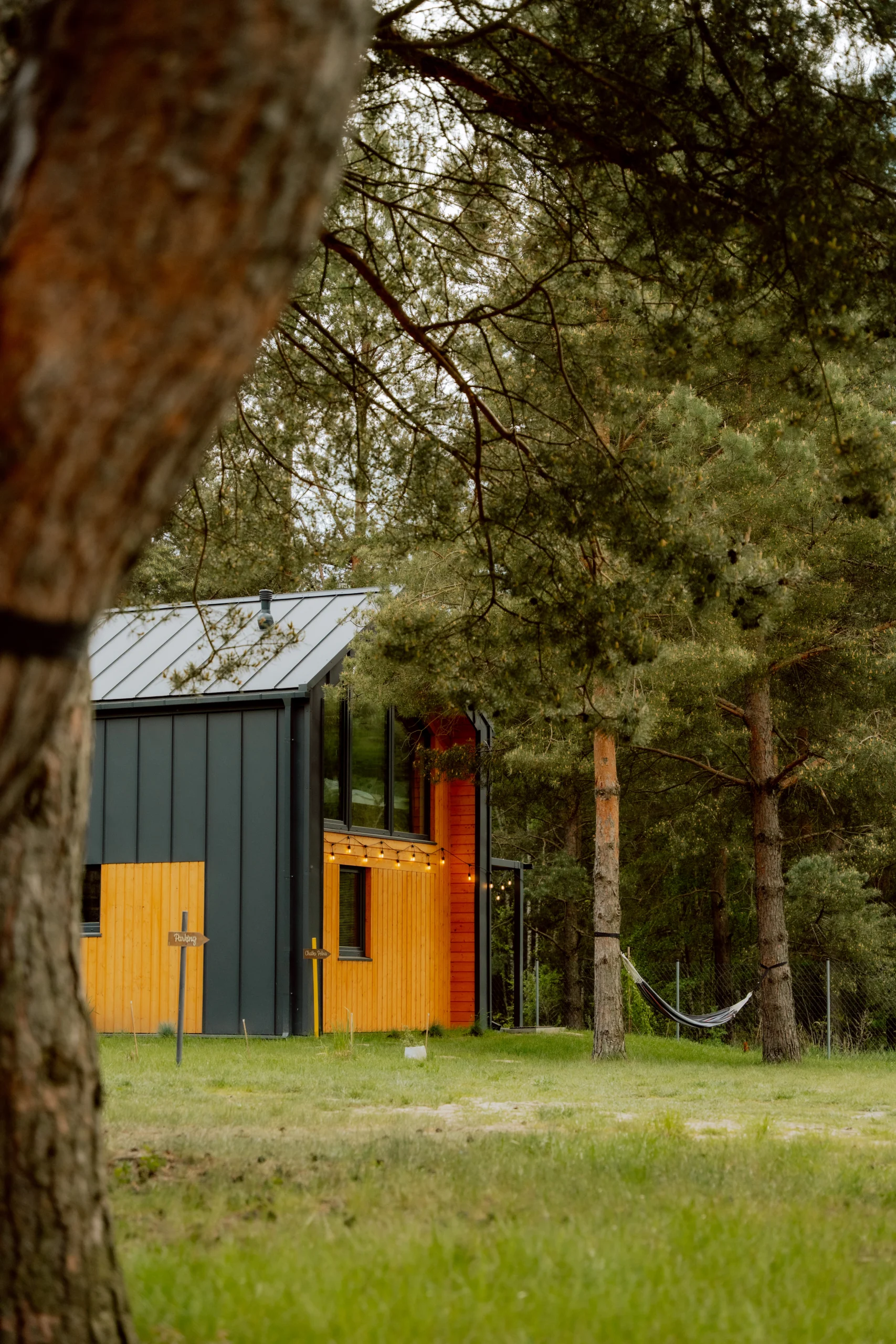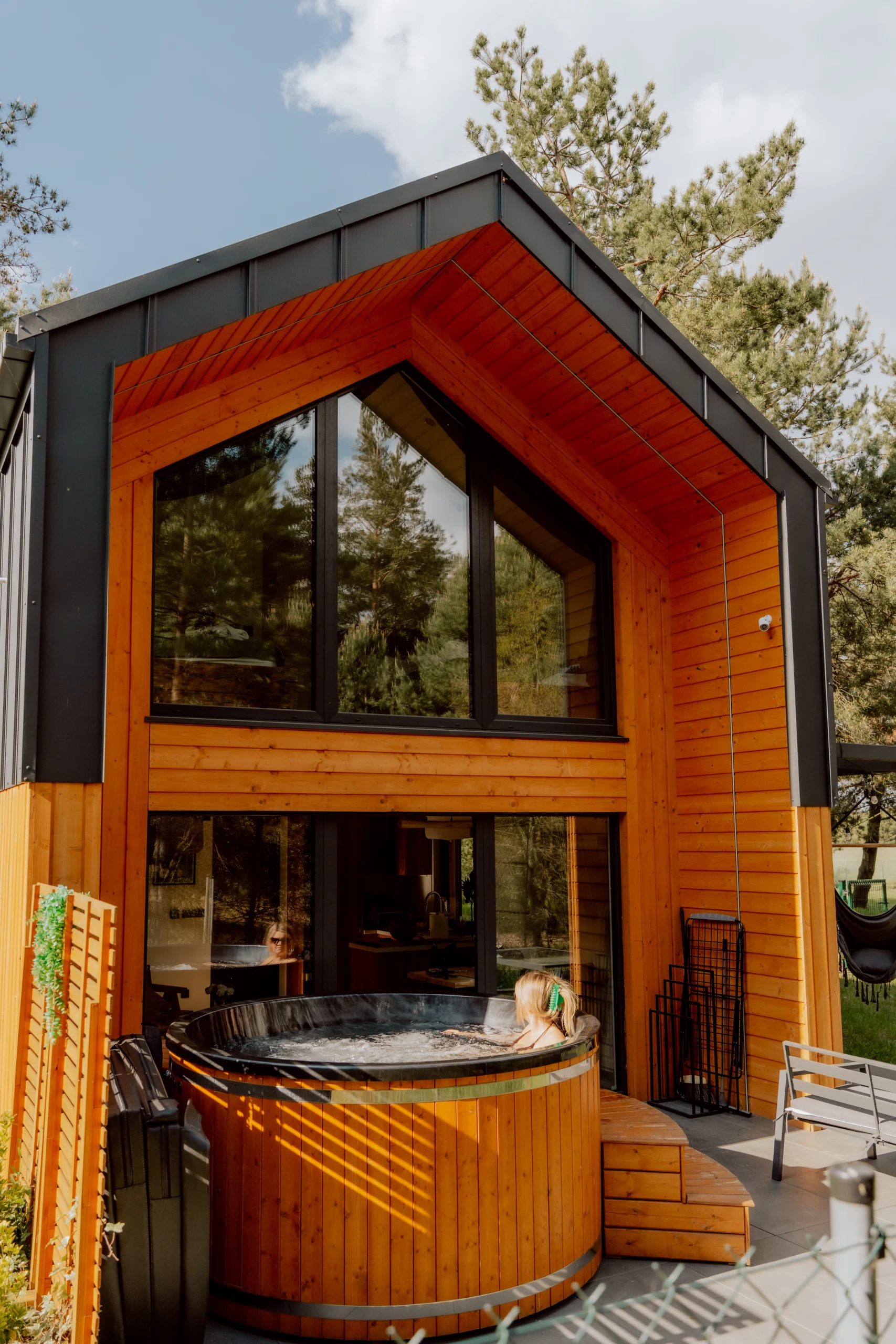 Nowoczesna chatka z prywatną balią, która zaprasza ciepłymi, żółtymi akcentami. Jest przestronna, pełna światła i ciepła, co czyni ją idealnym miejscem na relaksujący wyjazd.